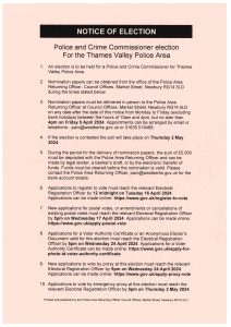 2. Nomination papers can be obtained from the office of the Police Area Returning Oficer, Council Offices, Market Street, Newbury RG14 5LD during the times stated below.