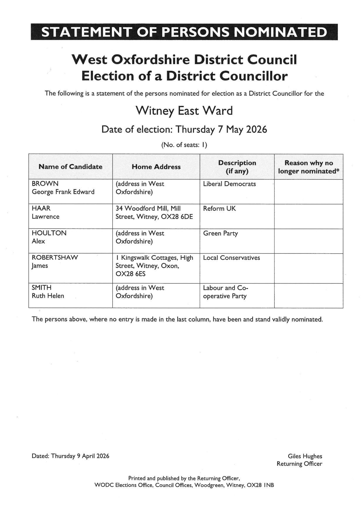 Statement of Persons Nominated – West Oxfordshire District Council Election of a District Councillor