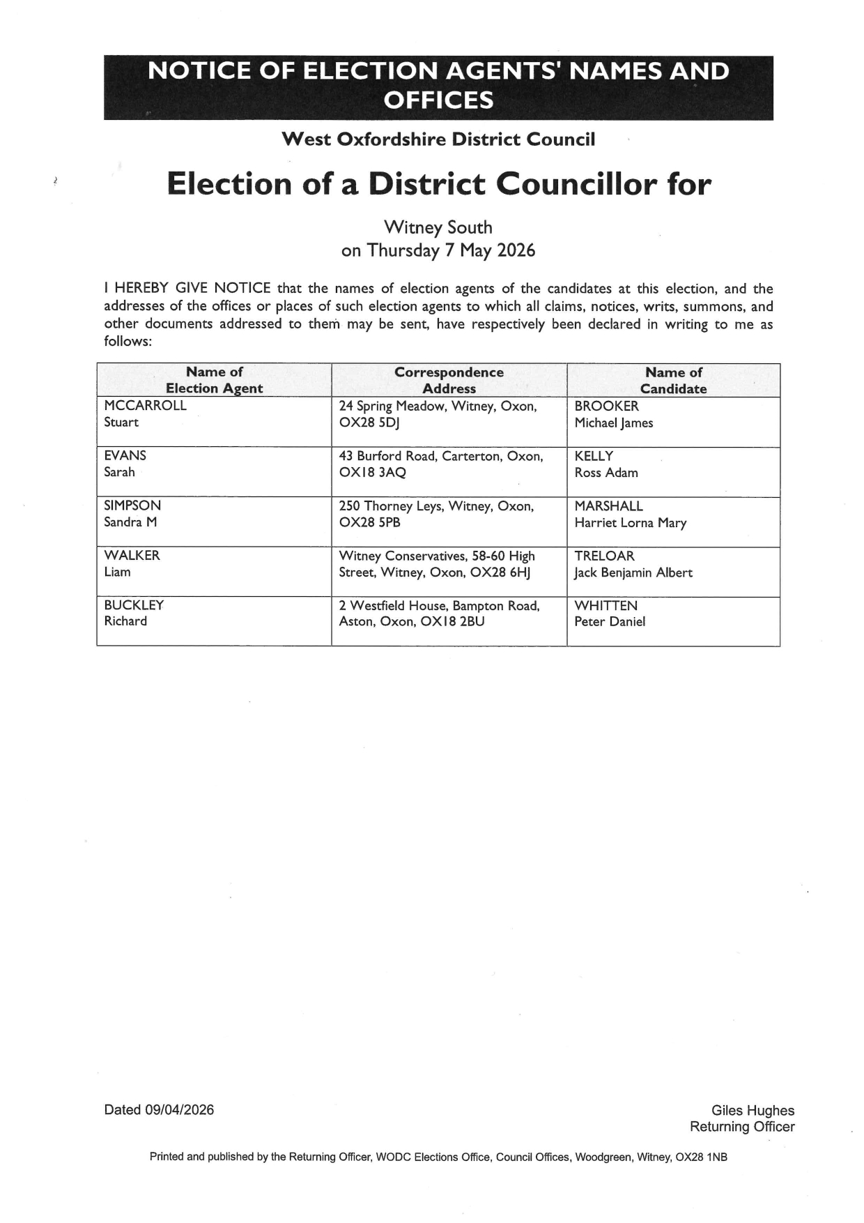 I HEREBY GIVE NOTICE that the names of election agents of the candidates at this election, and the addresses of the offices or places of such election agents to which all claims, notices, writs, summons, and other documents addressed to them may be sent, have respectively been declared in writing to me as follows: