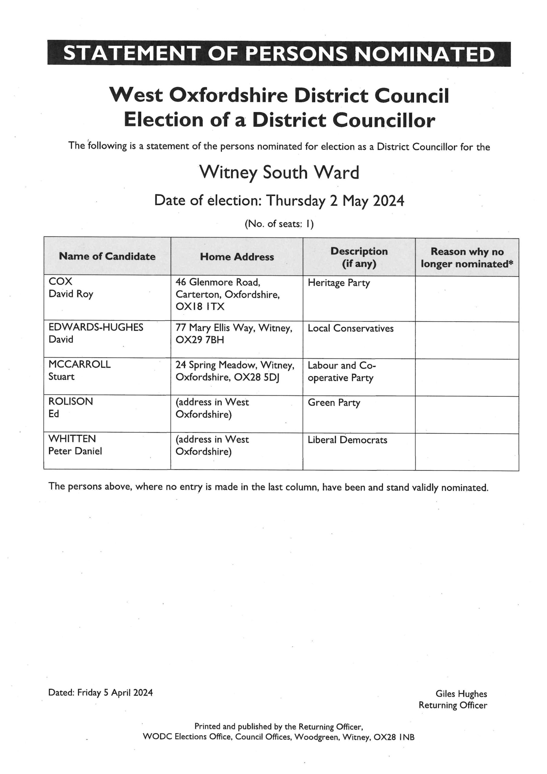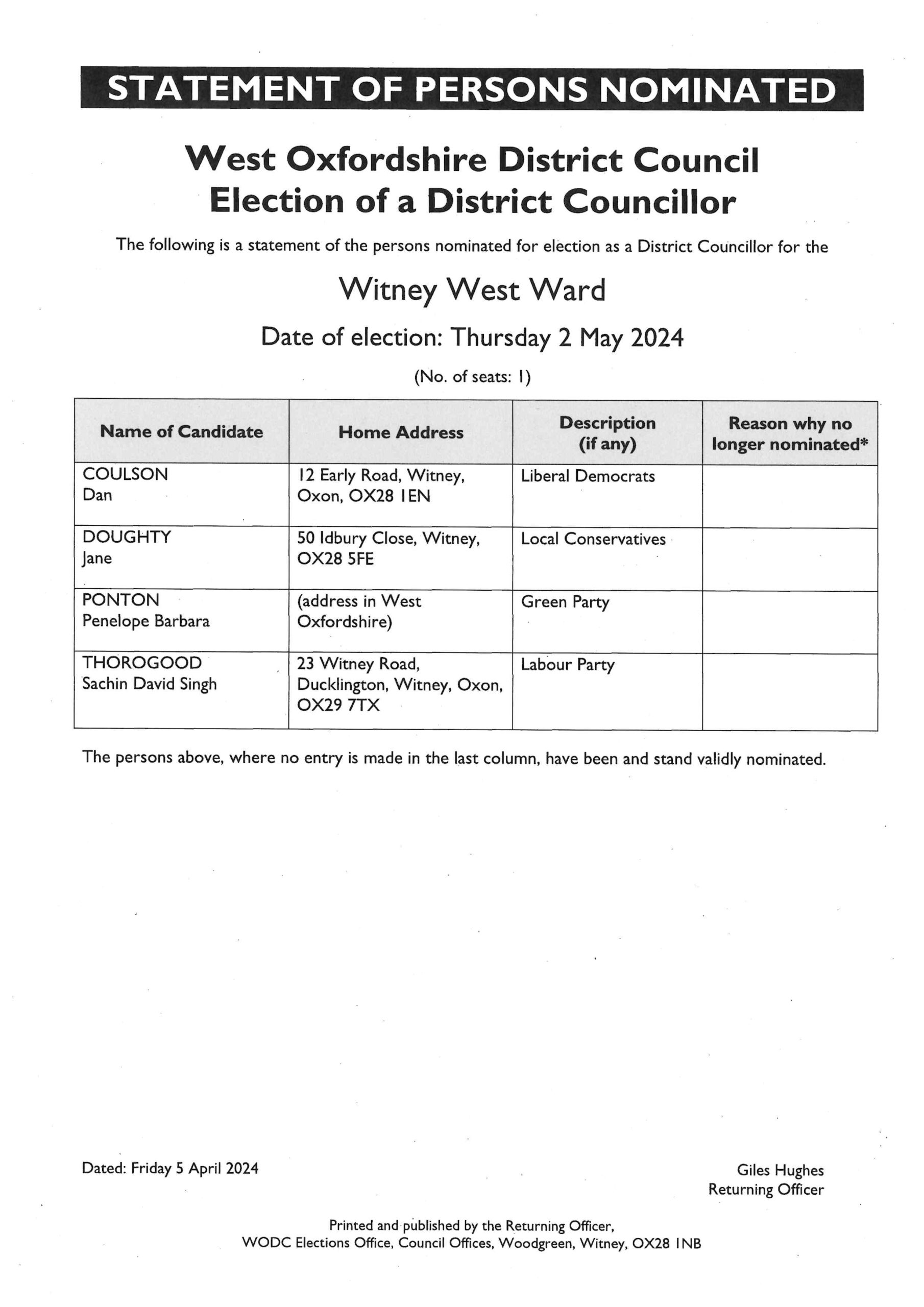 The following is a statement of the persons nominated for election as a District Councillor for the
