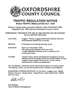 In the interests of public safety, it will be necessary for Oxfordshire County Council to close the road and impose a ‘No Waiting’ restriction as detailed above to facilitate pre-surfacing dressing works