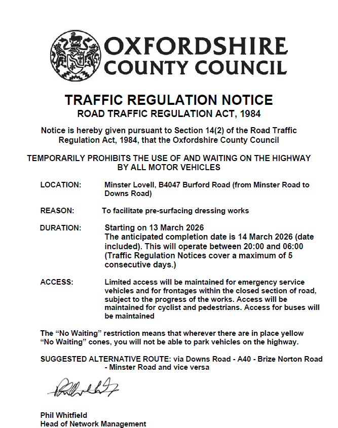 In the interests of public safety, it will be necessary for Oxfordshire County Council to close the road and impose a ‘No Waiting’ restriction as detailed above to facilitate pre-surfacing dressing works