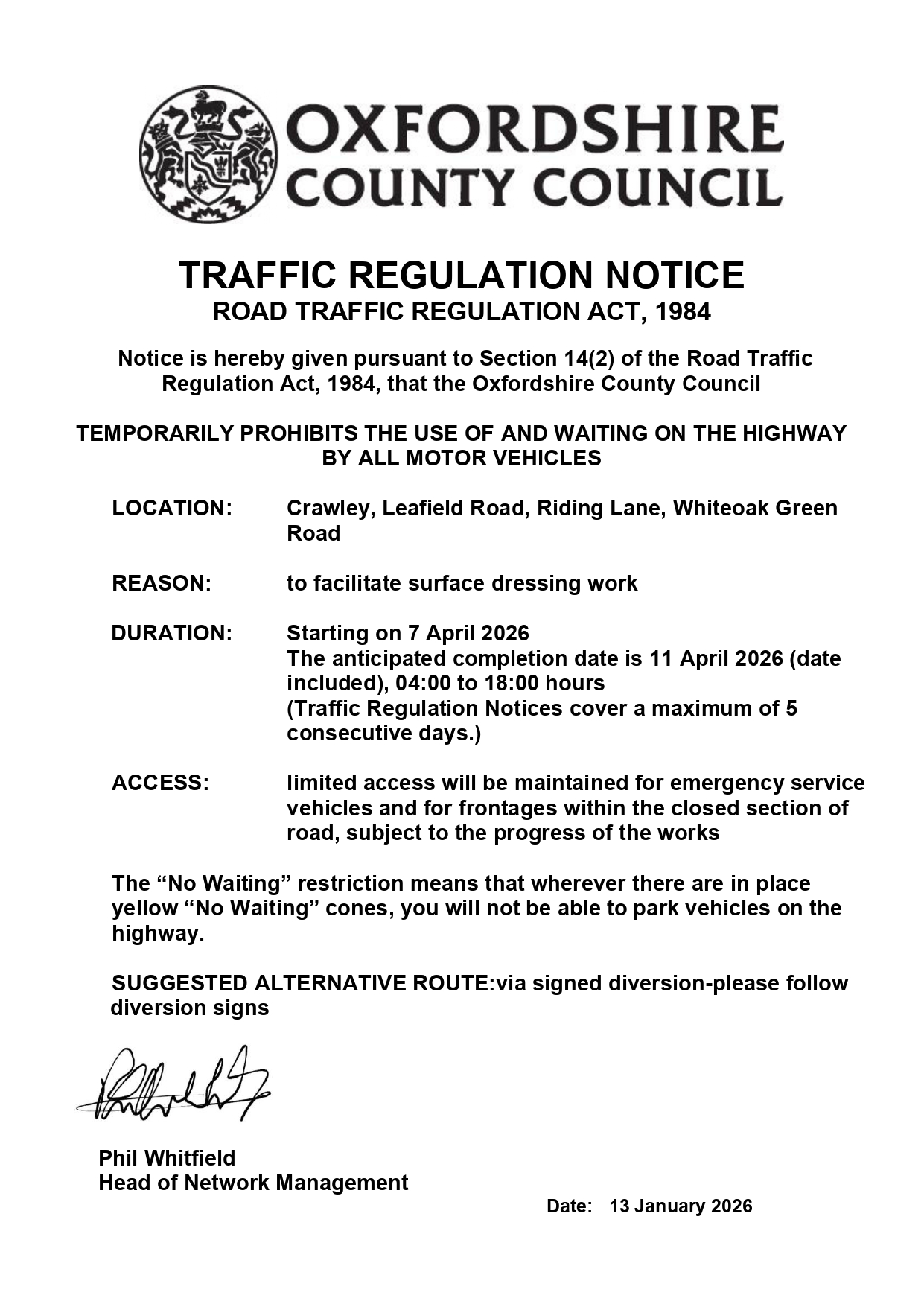 Temporary Road Closure and No Waiting – Minster Lovell, B4047 Burford Road