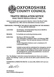Temporary Road Closure and “No Waiting” restriction – at Ducklington, A415 Standlake Road