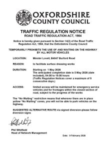 In the interests of public safety, it will be necessary for Oxfordshire County Council to close the road and impose a ‘No Waiting’ restriction as detailed above to facilitate surface dressing works.