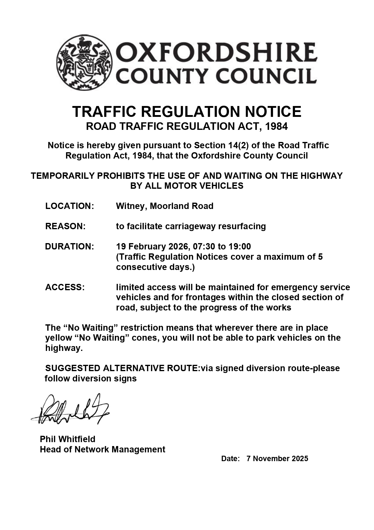 Temporary Road Closure and “No Waiting” restriction at Moorland Road, Witney