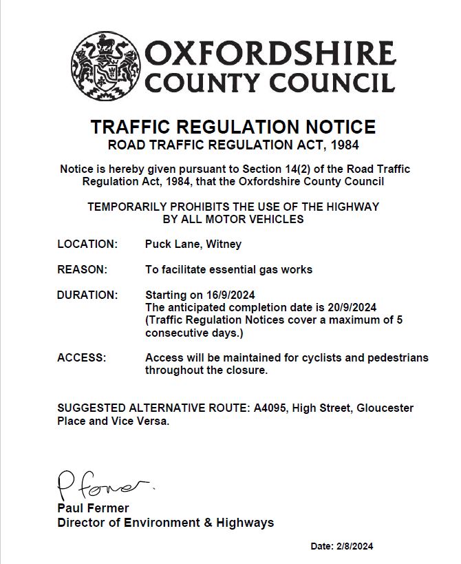 A temporary Notice is being made by Oxfordshire County Council to implement the temporary restriction and will operate from 16/9/2024 up to and including 20/9/2024.