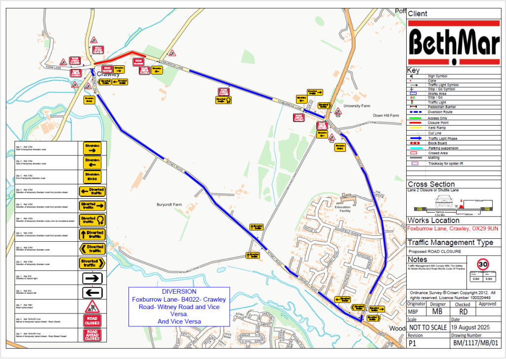 Temporary Road Closure at Crawley, street through Crawley and Foxburrow Lane