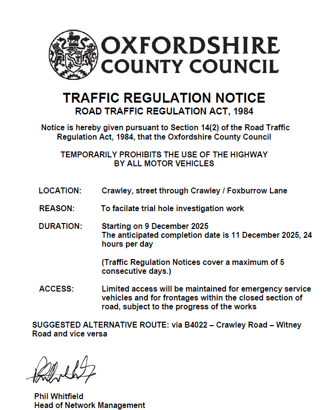 A temporary Notice is being made by Oxfordshire County Council to implement the temporary restriction and will operate from 9 December 2025 up to and including 11 December 2025, 24 hours per day.