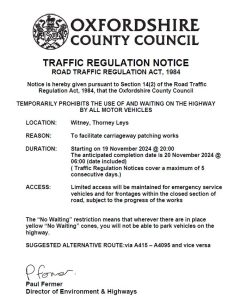 In the interests of public safety, it will be necessary for Oxfordshire County Council to close the road and impose a ‘No Waiting’ restriction as detailed above to facilitate carriageway patching works.