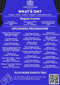 You can take a look at the Corn Exchange Website for a full calendar of events taking place at the Corn Exchange Witney.